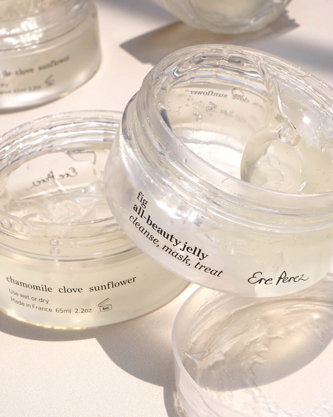 Una gelatina todoterreno que mima tu piel mientras limpia e hidrata. Se funde suavemente para eliminar cualquier rastro de maquillaje e impurezas, incluso el maquillaje de ojos. Puedes usarla en seco como limpiador, o añadir un poco de agua para transformarla en una leche limpiadora suave y calmante. La piel queda limpia y sedosa, sin sensación de tirantez.